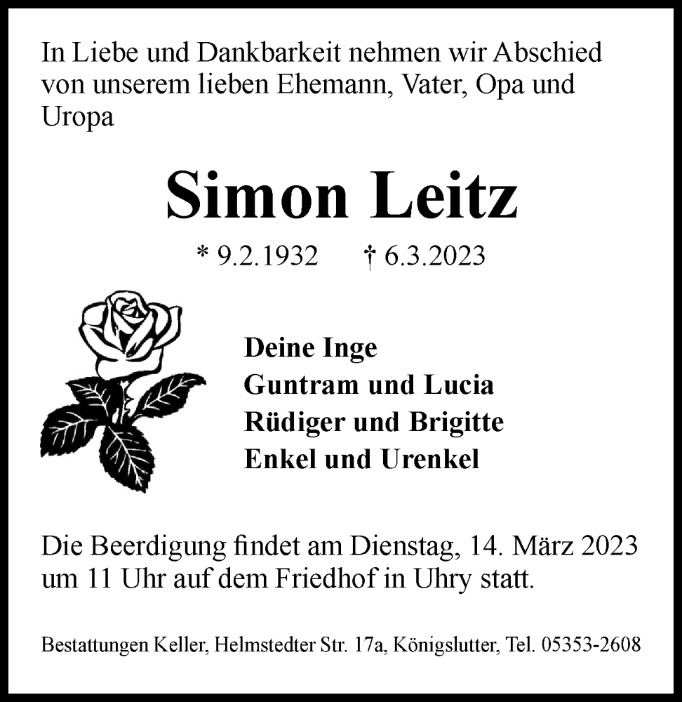 Hier finden Sie alle Traueranzeigen aus der Zeitung, die bisher für Simon Leitz erschienen sind. Weitere Traueranzeigen, die in der Zeitung erscheinen, werden hier ebenfalls aufgelistet
