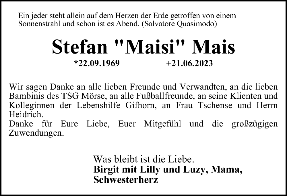 Hier finden Sie alle Traueranzeigen aus der Zeitung, die bisher für Stefan Mais erschienen sind. Weitere Traueranzeigen, die in der Zeitung erscheinen, werden hier ebenfalls aufgelistet