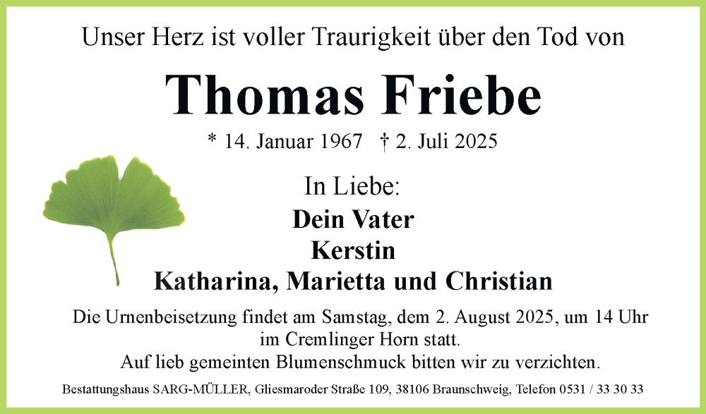 Hier finden Sie alle Traueranzeigen aus der Zeitung, die bisher für Thomas Friebe erschienen sind. Weitere Traueranzeigen, die in der Zeitung erscheinen, werden hier ebenfalls aufgelistet