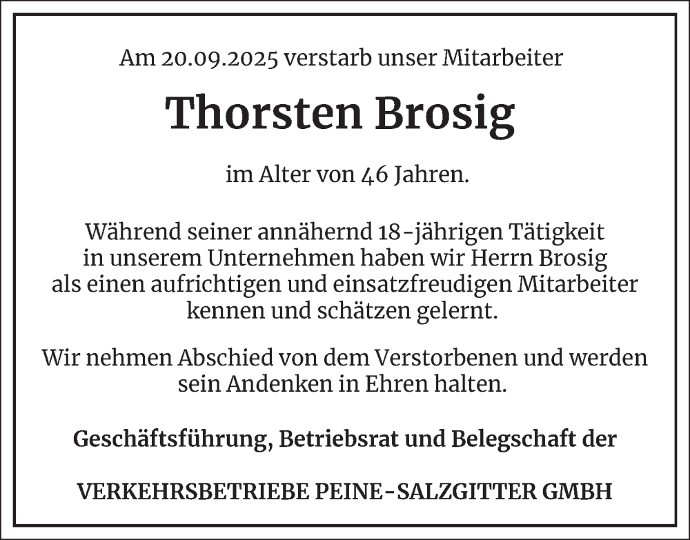 Hier finden Sie alle Traueranzeigen aus der Zeitung, die bisher für Thorsten Brosig erschienen sind. Weitere Traueranzeigen, die in der Zeitung erscheinen, werden hier ebenfalls aufgelistet