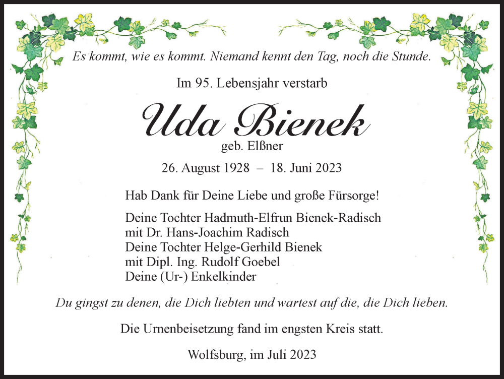 Hier finden Sie alle Traueranzeigen aus der Zeitung, die bisher für Uda Bienek erschienen sind. Weitere Traueranzeigen, die in der Zeitung erscheinen, werden hier ebenfalls aufgelistet
