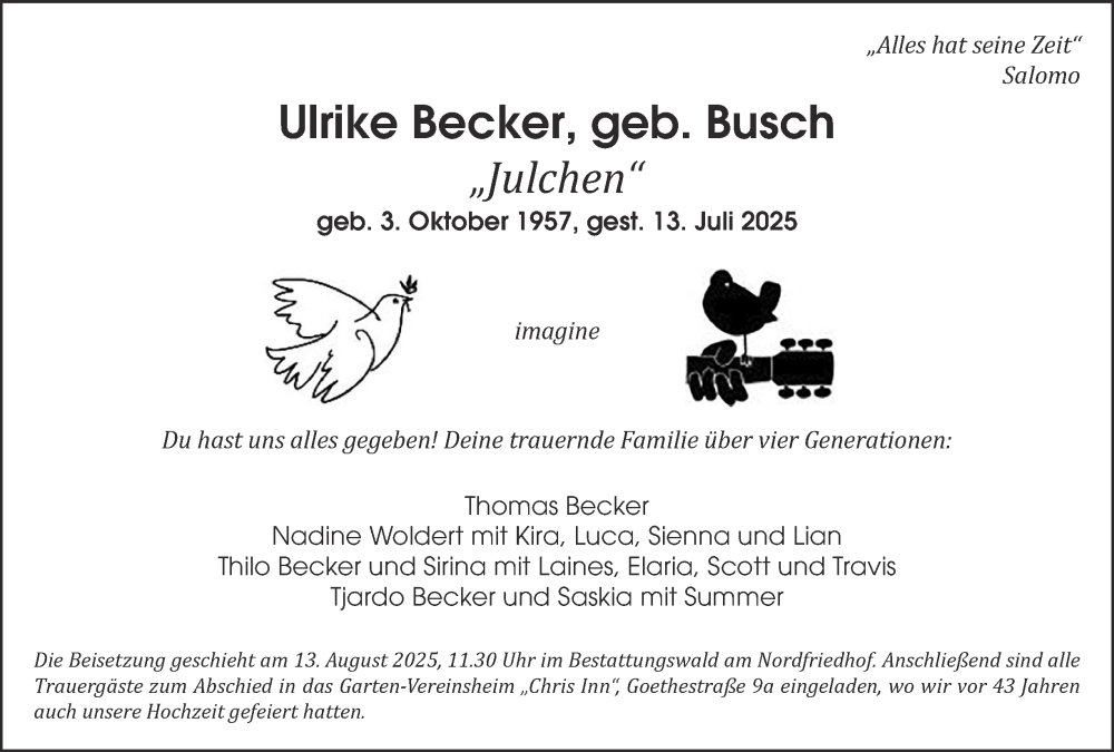 Hier finden Sie alle Traueranzeigen aus der Zeitung, die bisher für Ulrike Becker erschienen sind. Weitere Traueranzeigen, die in der Zeitung erscheinen, werden hier ebenfalls aufgelistet