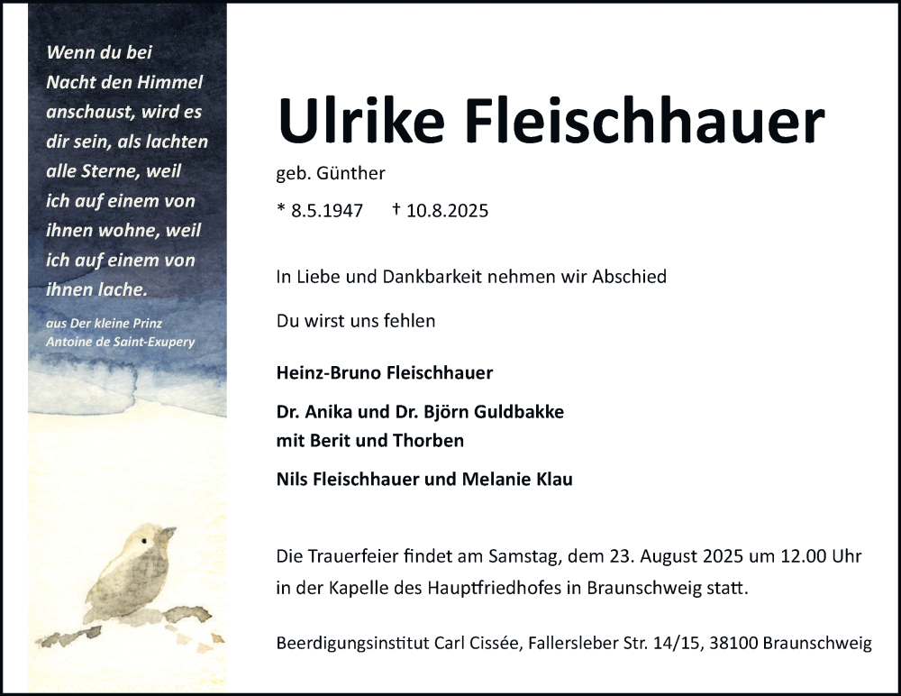 Hier finden Sie alle Traueranzeigen aus der Zeitung, die bisher für Ulrike Fleischhauer erschienen sind. Weitere Traueranzeigen, die in der Zeitung erscheinen, werden hier ebenfalls aufgelistet