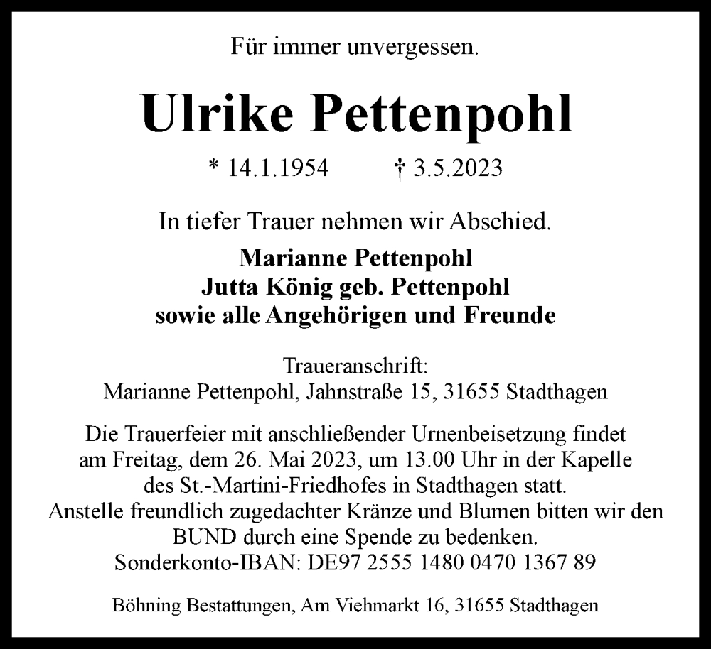 Hier finden Sie alle Traueranzeigen aus der Zeitung, die bisher für Ulrike Pettenpohl erschienen sind. Weitere Traueranzeigen, die in der Zeitung erscheinen, werden hier ebenfalls aufgelistet