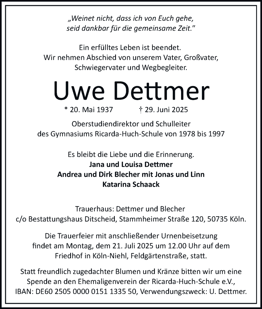 Hier finden Sie alle Traueranzeigen aus der Zeitung, die bisher für Uwe Dettmer erschienen sind. Weitere Traueranzeigen, die in der Zeitung erscheinen, werden hier ebenfalls aufgelistet