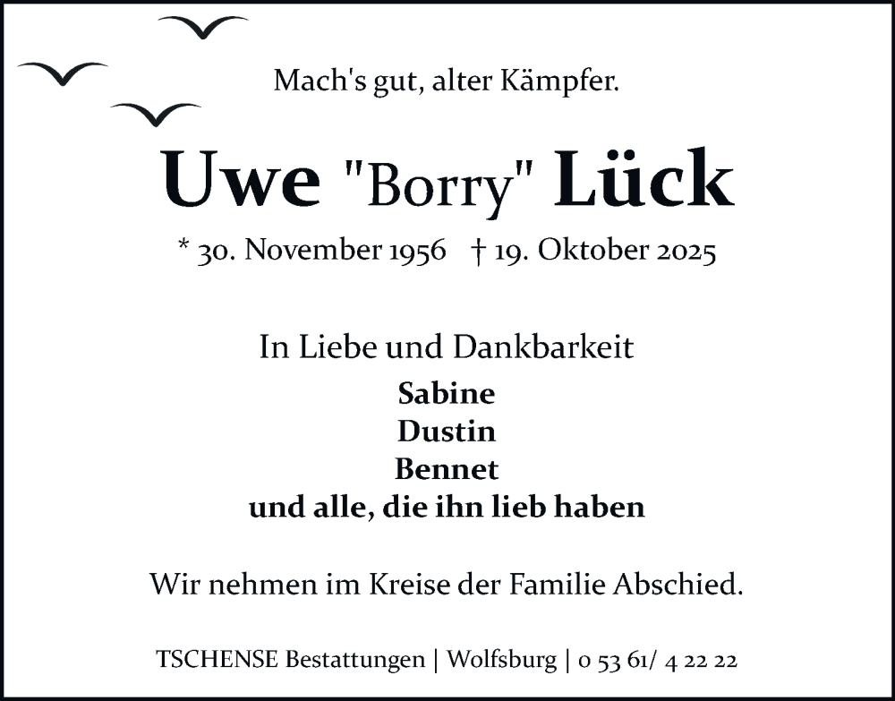 Hier finden Sie alle Traueranzeigen aus der Zeitung, die bisher für Uwe Lück erschienen sind. Weitere Traueranzeigen, die in der Zeitung erscheinen, werden hier ebenfalls aufgelistet