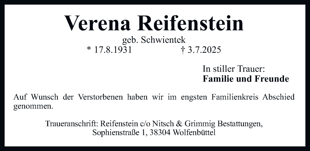 Hier finden Sie alle Traueranzeigen aus der Zeitung, die bisher für Verena Reifenstein erschienen sind. Weitere Traueranzeigen, die in der Zeitung erscheinen, werden hier ebenfalls aufgelistet