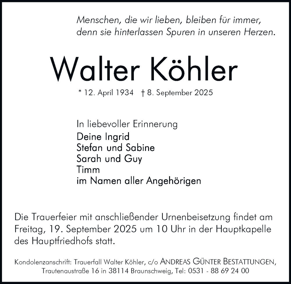 Hier finden Sie alle Traueranzeigen aus der Zeitung, die bisher für Walter Köhler erschienen sind. Weitere Traueranzeigen, die in der Zeitung erscheinen, werden hier ebenfalls aufgelistet