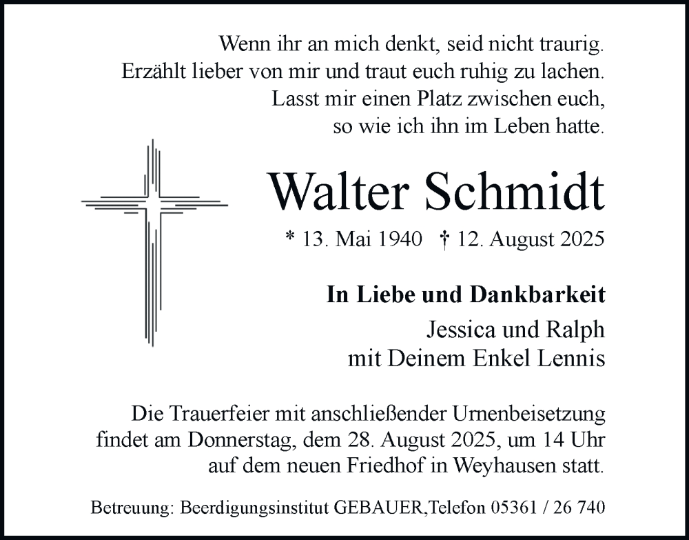 Hier finden Sie alle Traueranzeigen aus der Zeitung, die bisher für Walter Schmidt erschienen sind. Weitere Traueranzeigen, die in der Zeitung erscheinen, werden hier ebenfalls aufgelistet