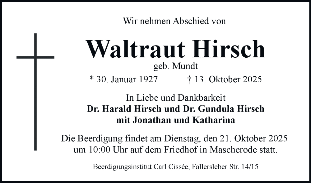Hier finden Sie alle Traueranzeigen aus der Zeitung, die bisher für Waltraut Hirsch erschienen sind. Weitere Traueranzeigen, die in der Zeitung erscheinen, werden hier ebenfalls aufgelistet