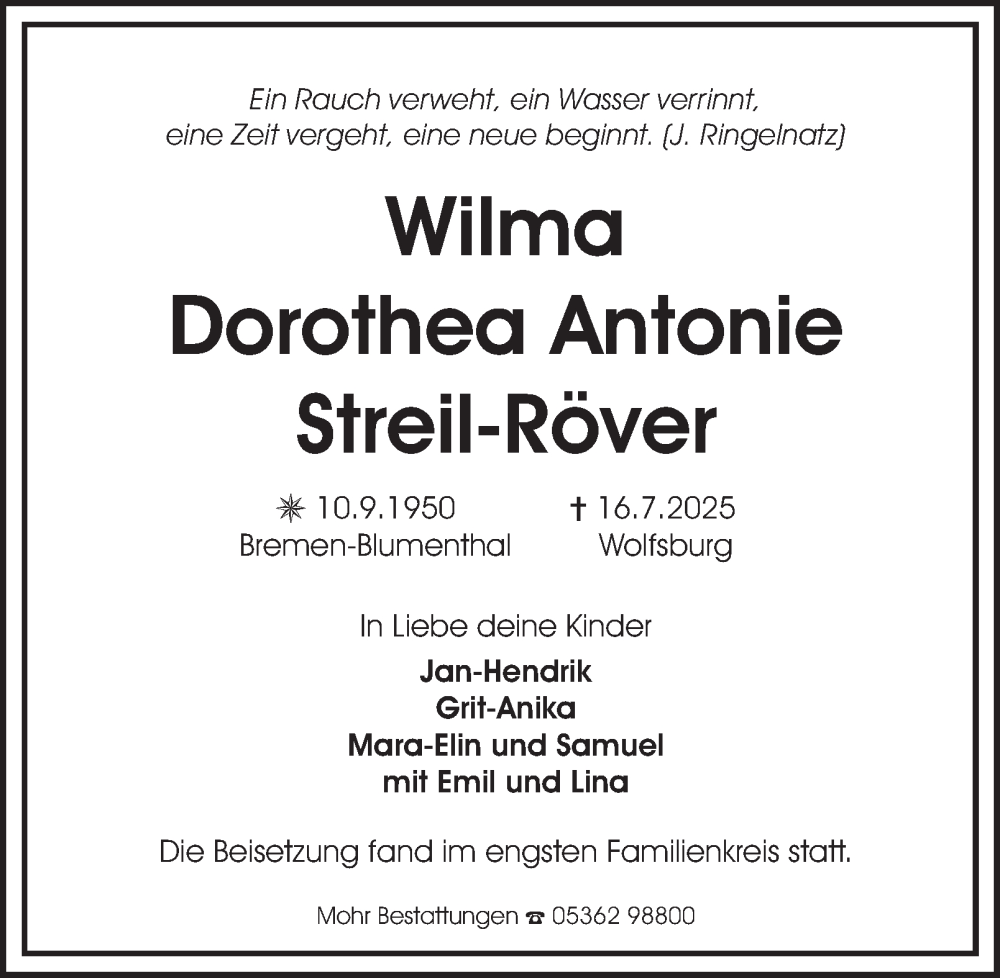 Hier finden Sie alle Traueranzeigen aus der Zeitung, die bisher für Wilma Dorothea Antonie Streil-Röver erschienen sind. Weitere Traueranzeigen, die in der Zeitung erscheinen, werden hier ebenfalls aufgelistet